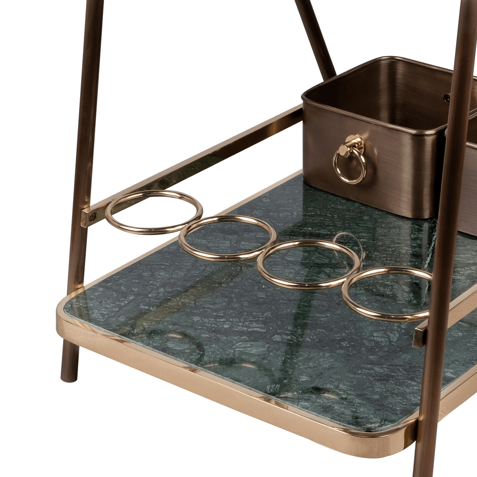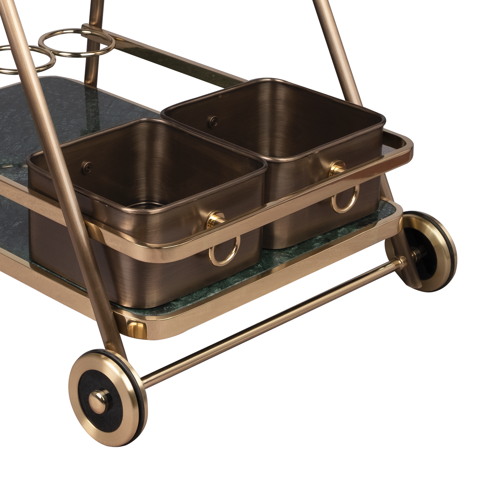 Decatur Bar Cart has also two wheels, containers and bottle holders. Distilling elegance, Decatur Bar Cart will be the exquisite touch to your project/space, where style stays still.