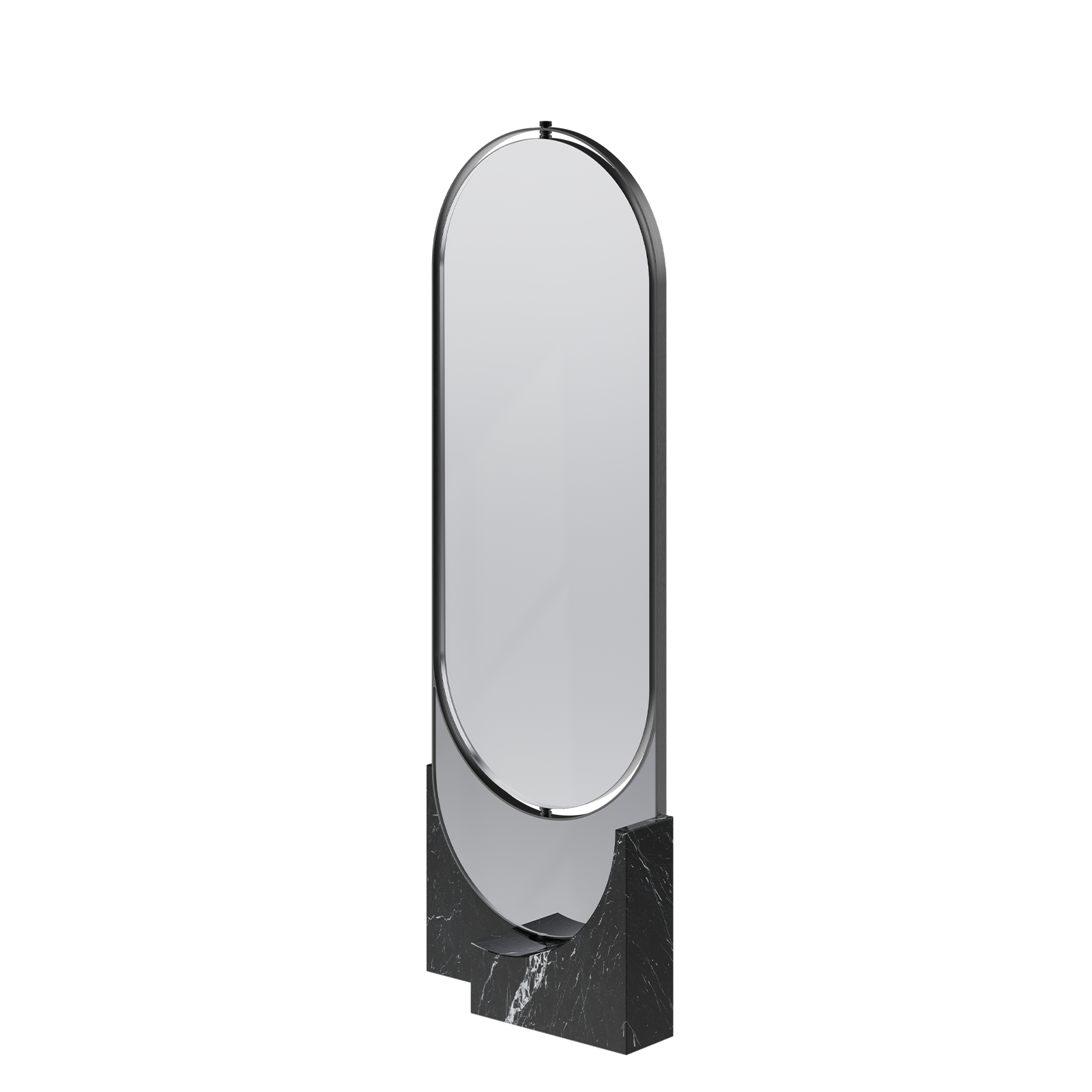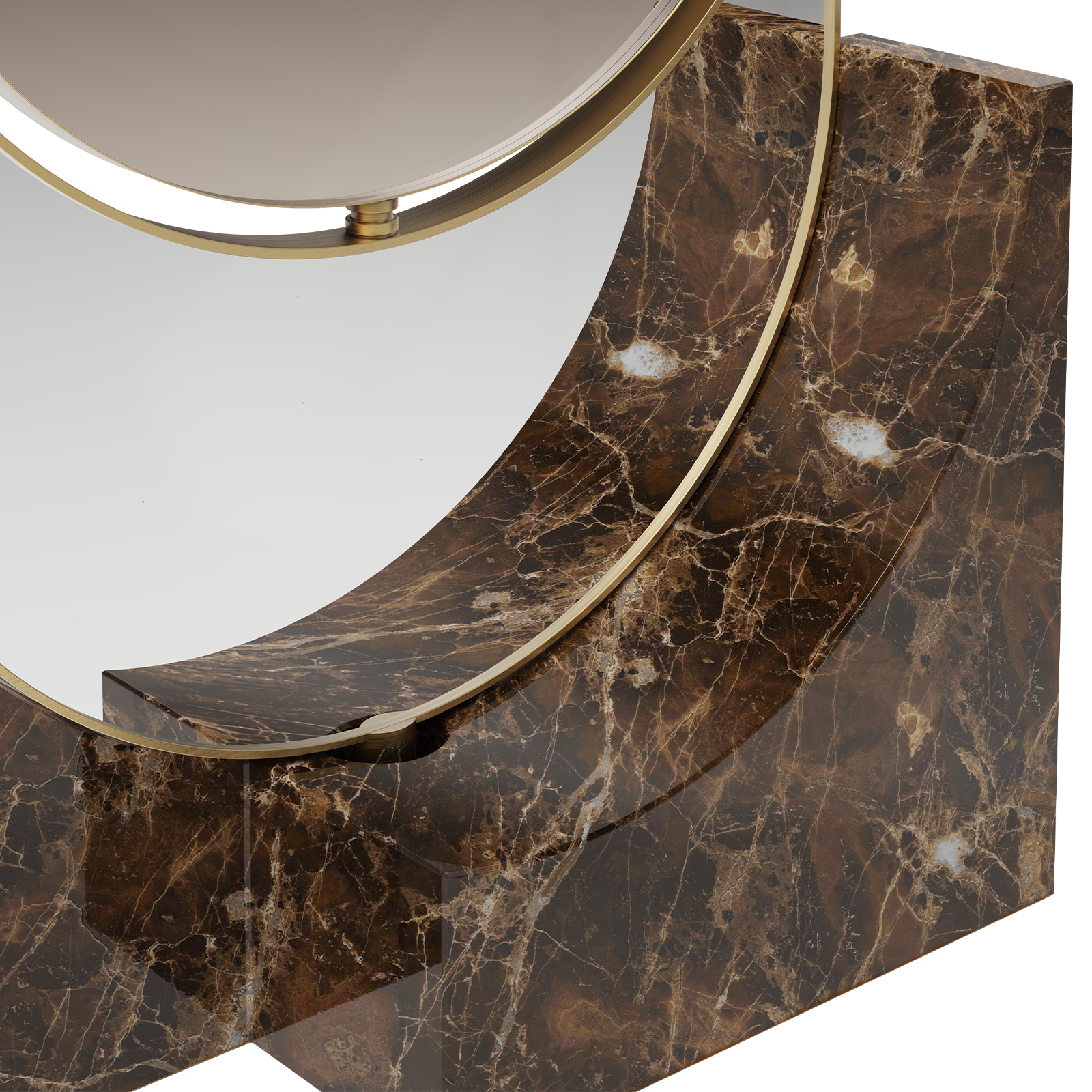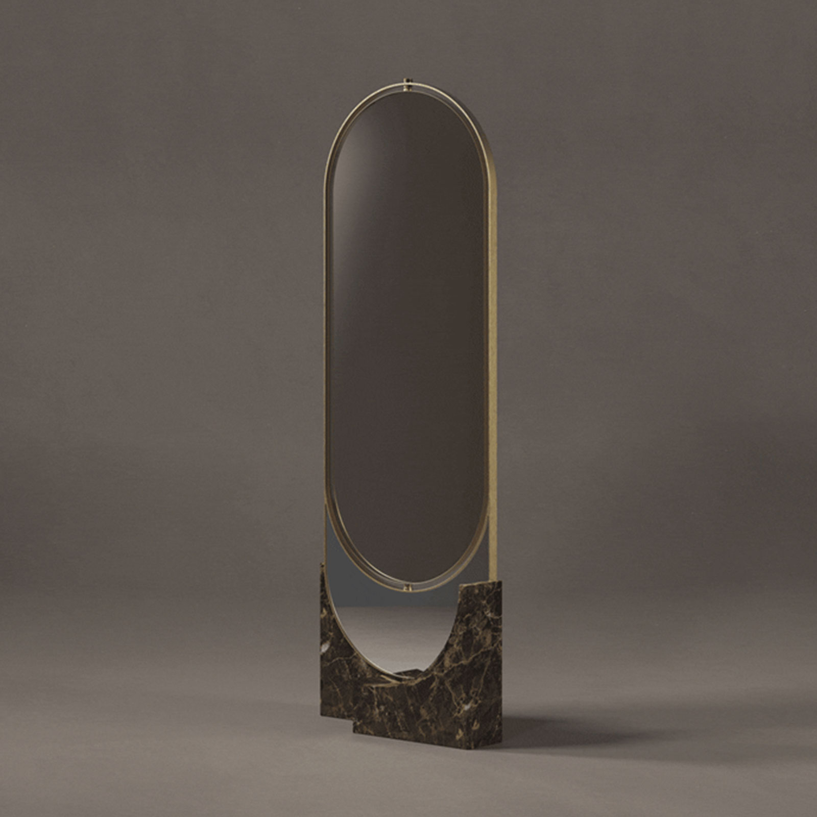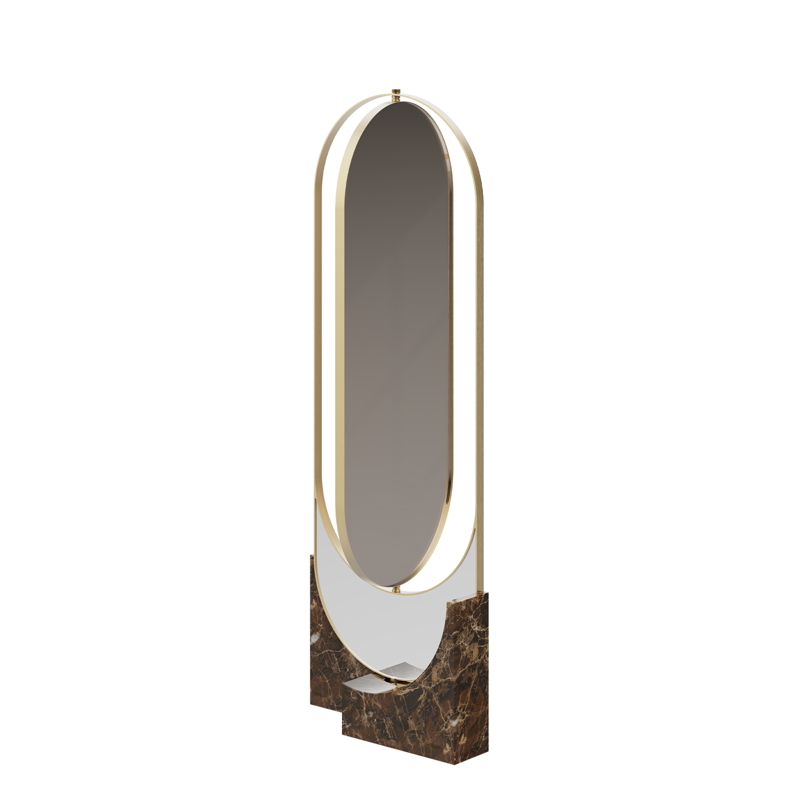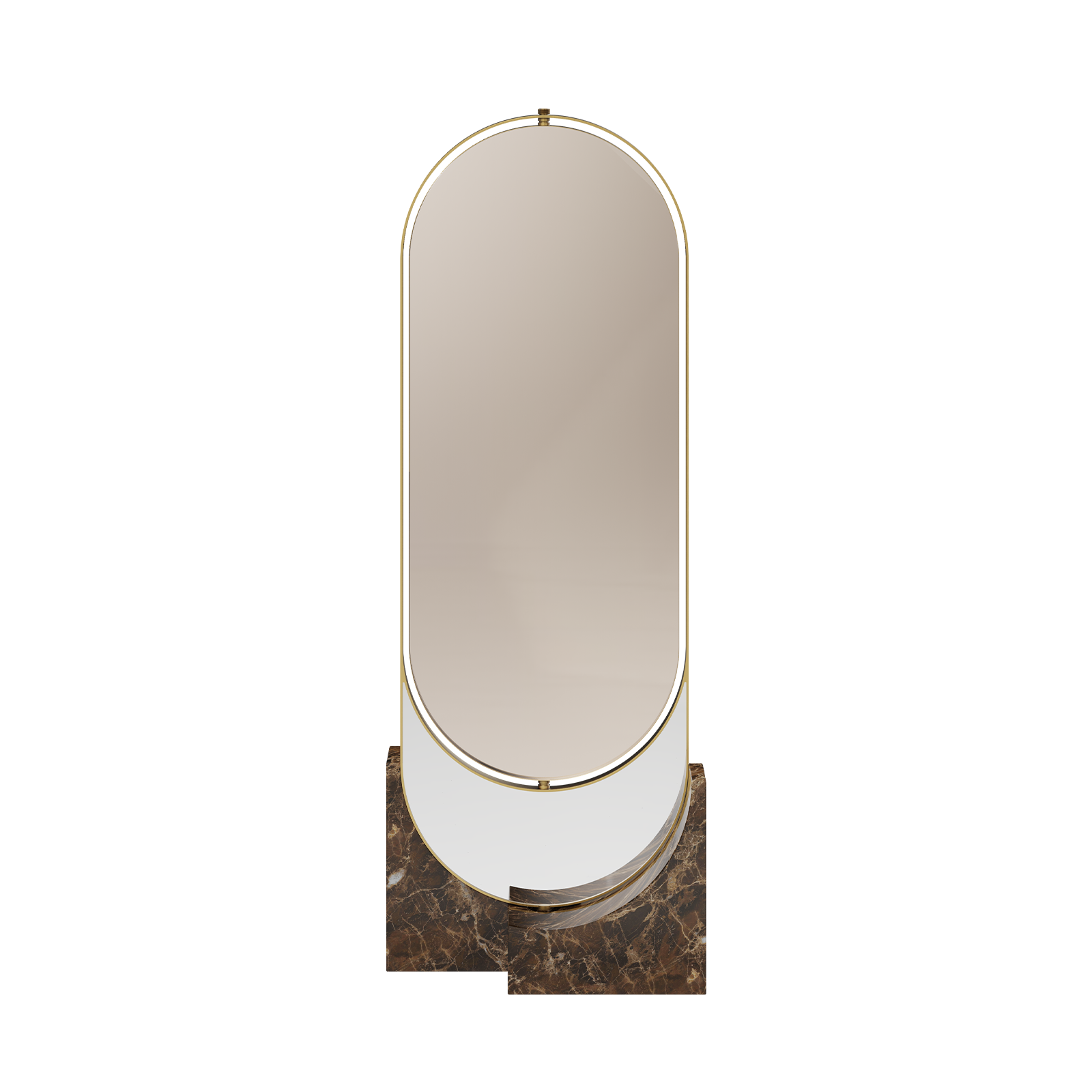 The bronze Hidden Floor Mirror appears from its back when you rotate it, showing a hidden version of itself. All this harmony flows down to an Emperador marble base, reminding us of the Hidden Lake in between the mountains. The Hidden Floor Mirror will reflect a whole different meaning of design into any room.