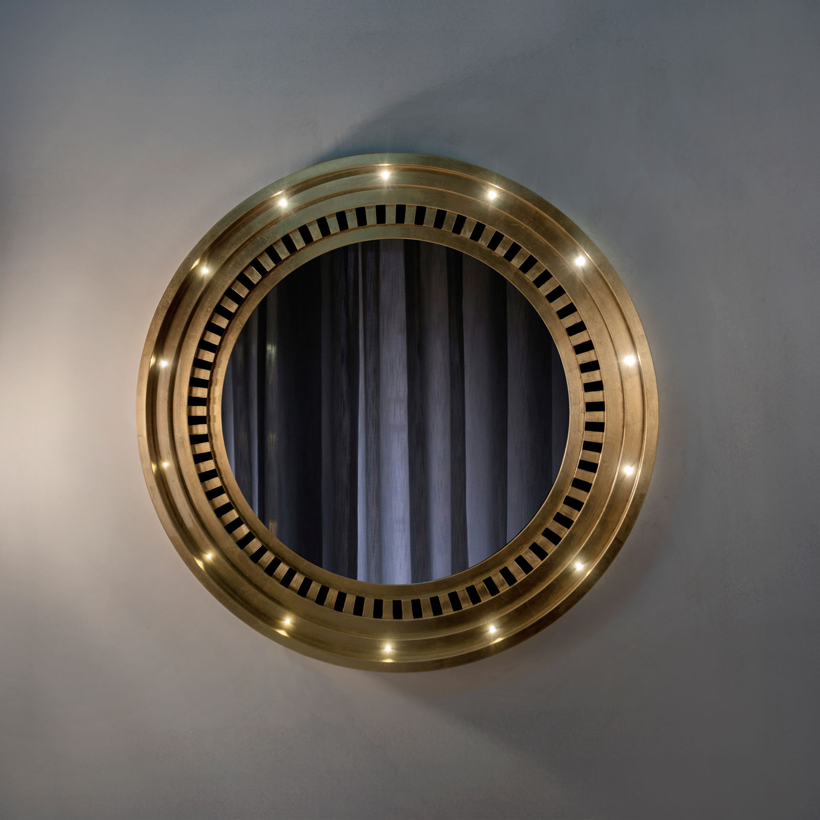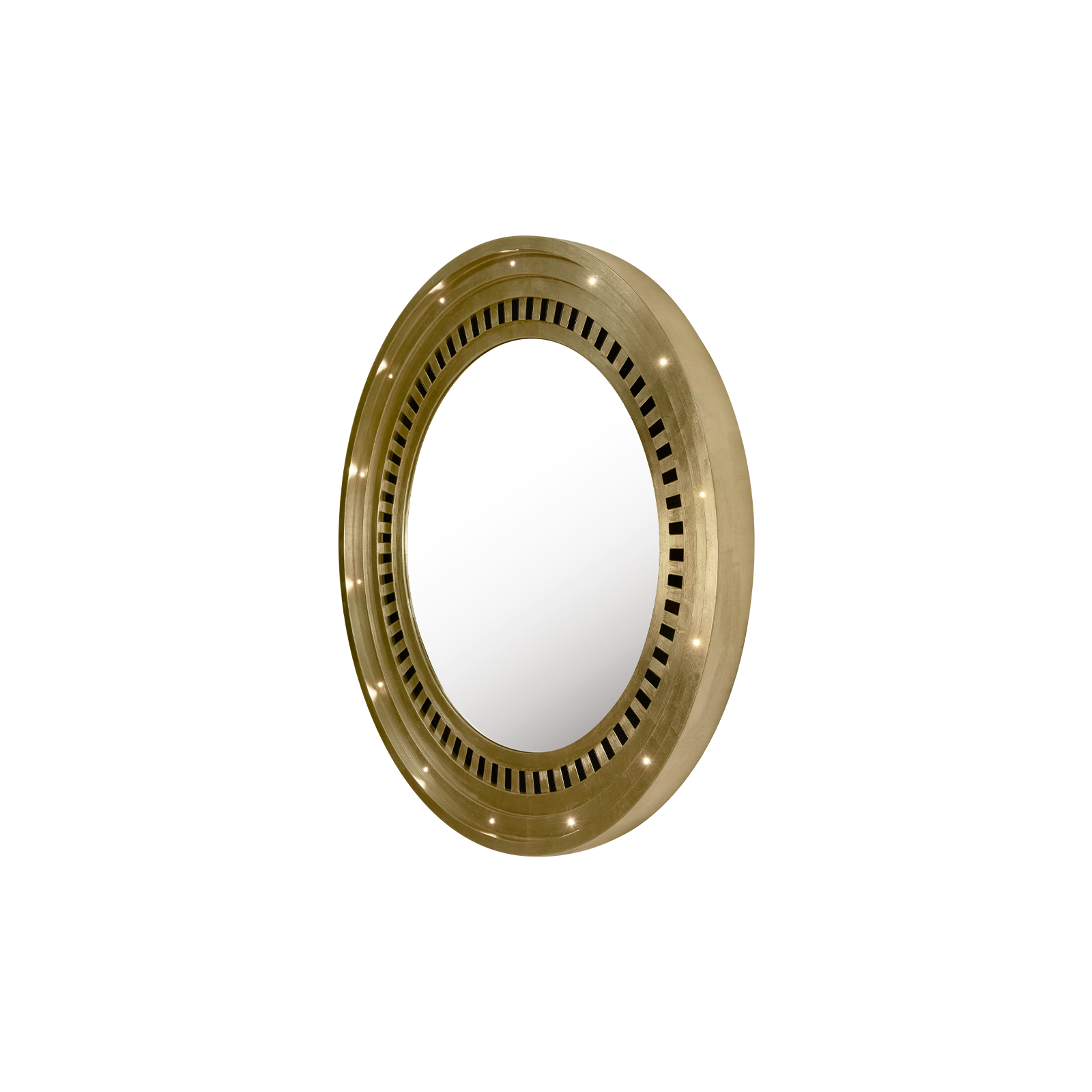 Sweeping the contour of the Hollywood Mirror are 14 led lights inspired by the stars along the sidewalks. With a structure made in wood with gold leaf finish, the Hollywood mirror promises to be the jewel of your décor.
