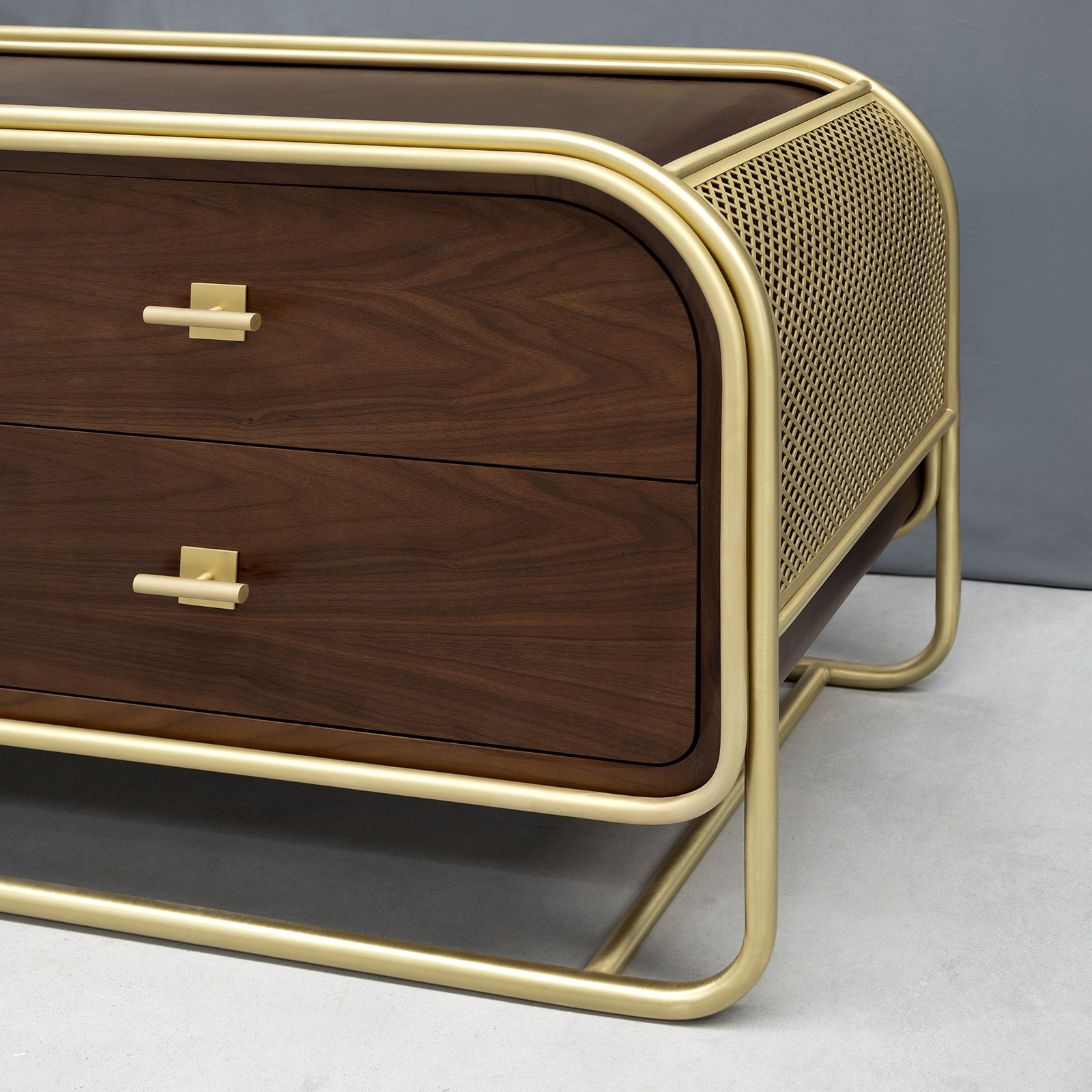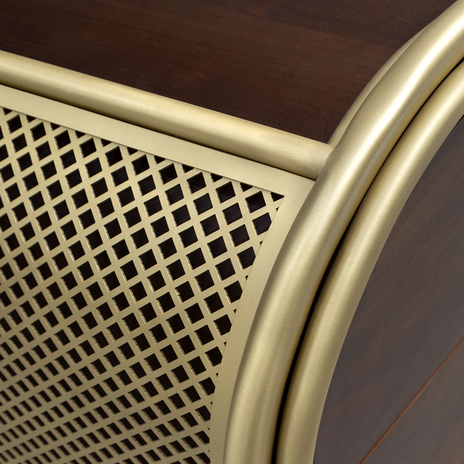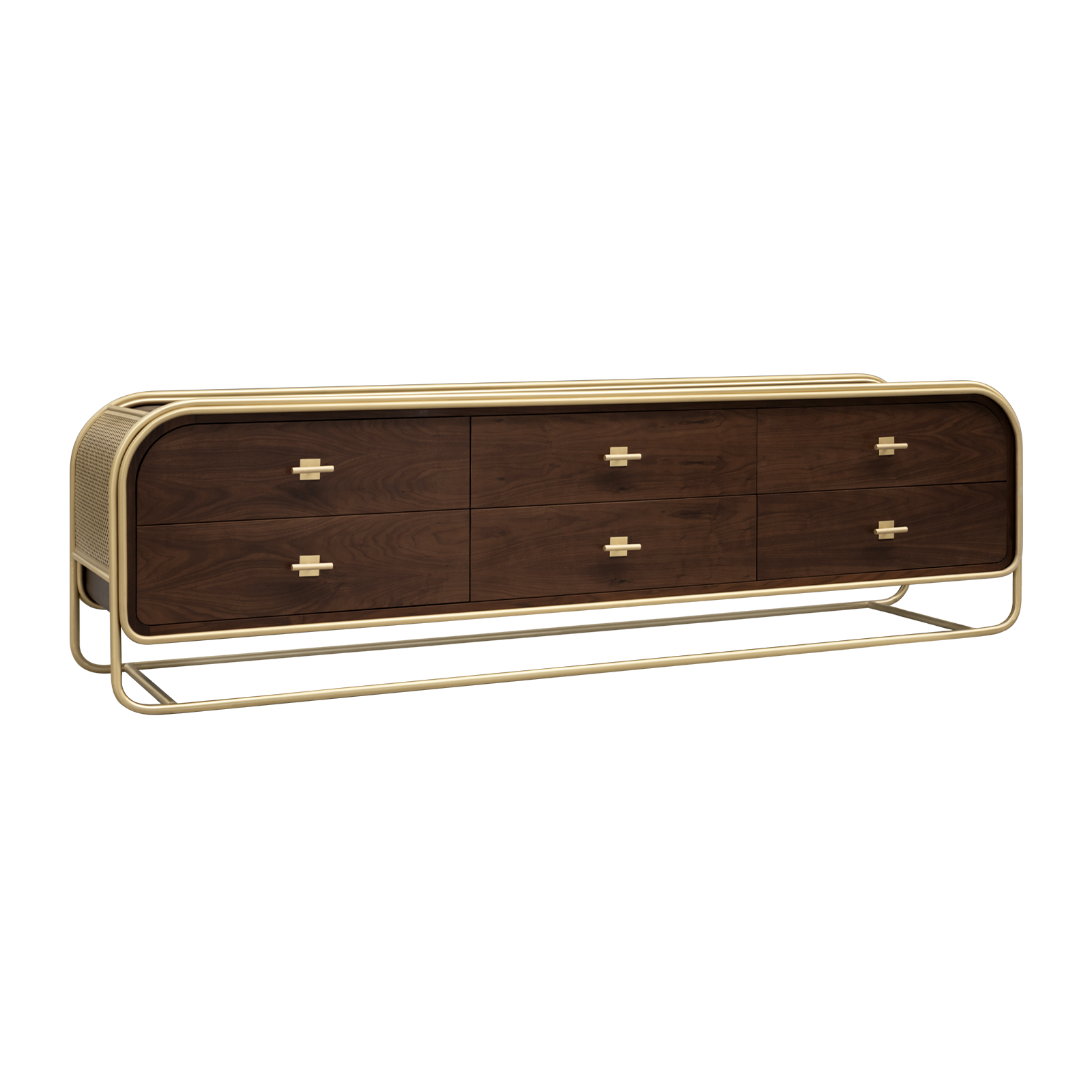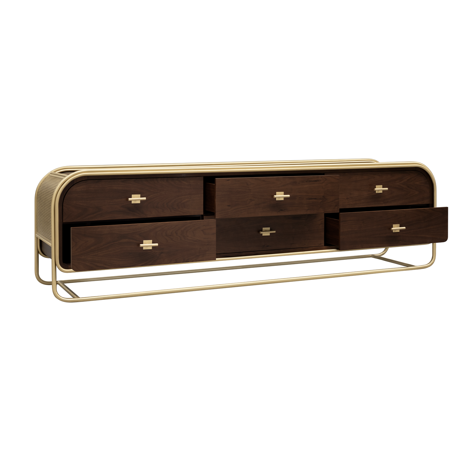 The modern Columbia Sideboard features a stunning brushed brass frame and a structure made in walnut wood with a high gloss varnish finish hide. On the inside, an exciting and exotic interior storage with lacquered wood drawers with a high gloss varnish, blended with 6 brushed brass handles.