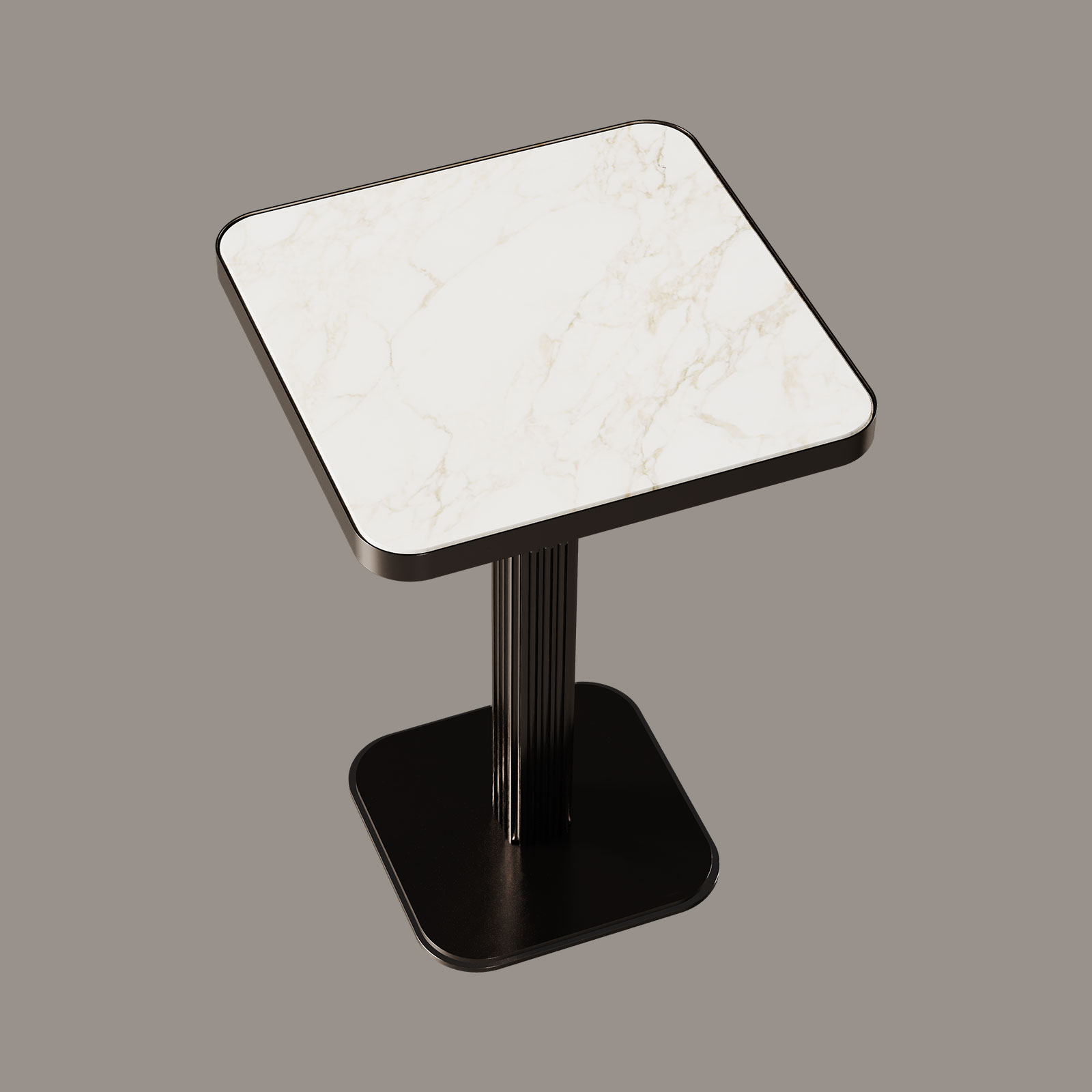 The square Staten bar table features a white estremoz marble, and its feet presents a distinctive visual effect, made of brushed stainless steel with gunmetal finished with satin varnish.