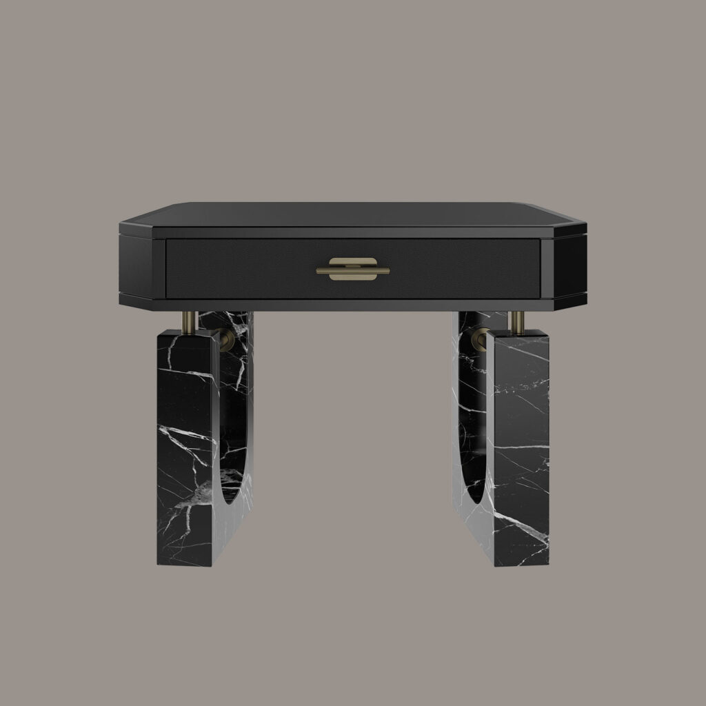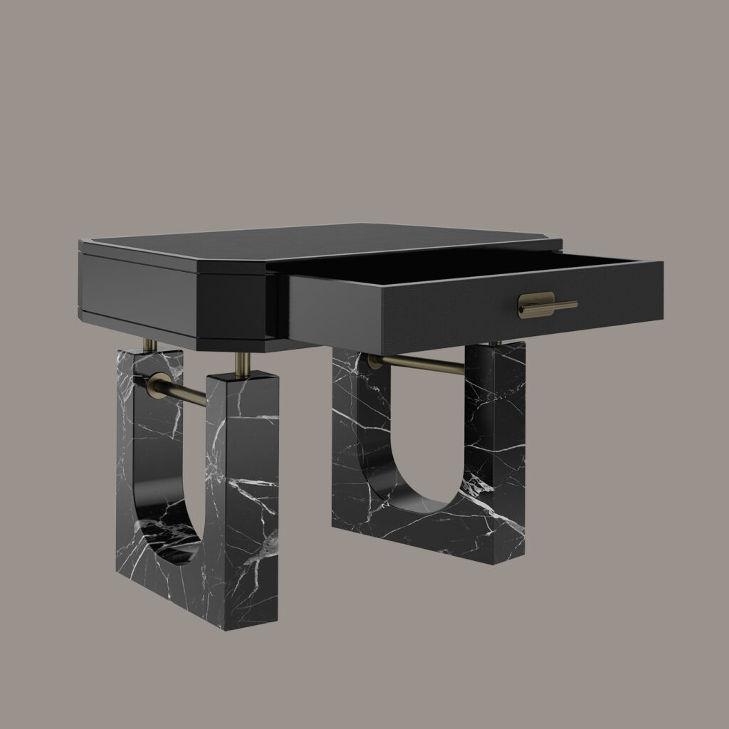 Inspired by such a mark of a nation, Porus Studio created the unforgettable mid-century modern Lincoln bedside table. The exquisite and handcrafted luxury Lincoln bedside table has a drawer finished in black high gloss varnish, contrasting with the main structure in Negro Marquina marble and aged brushed brass.