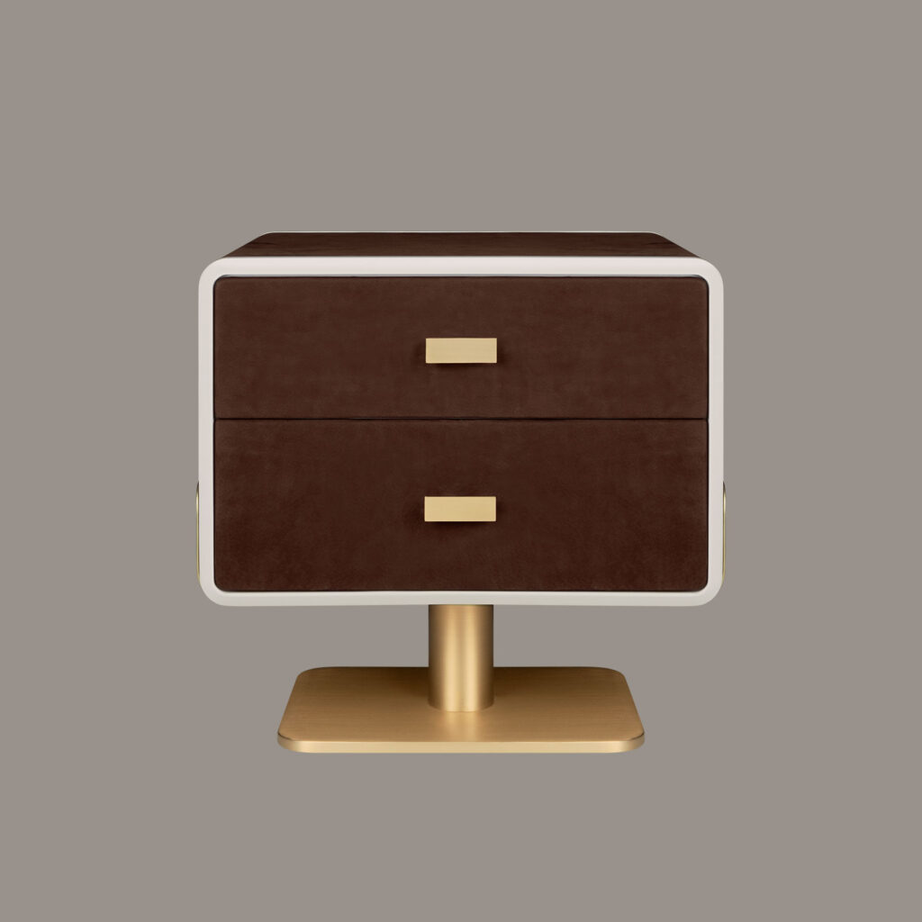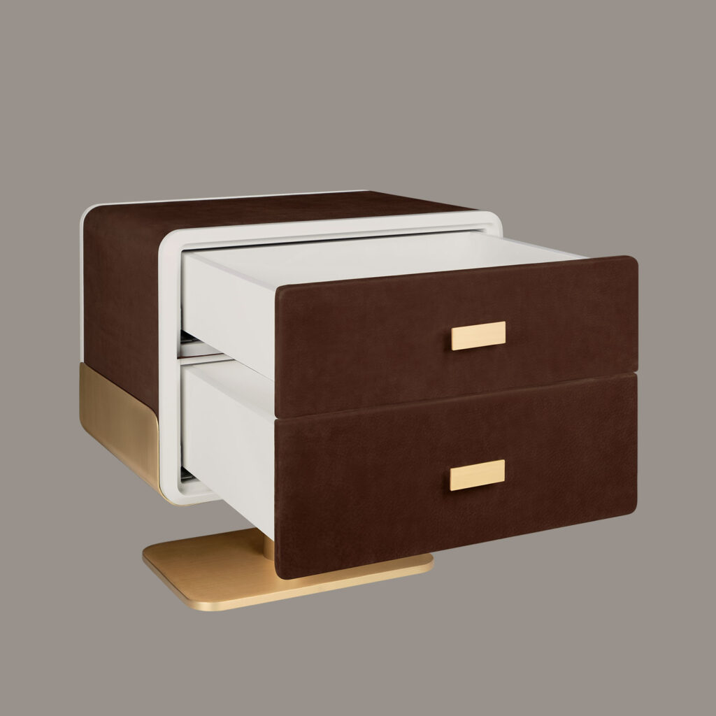 This modern piece reflects the city’s vibrant energy and refined lifestyle, blending artisanal Portuguese craftsmanship with contemporary design. The Phoenix Bedside Table features a brushed brass base that adds warmth and sophistication, supporting two lacquered wood drawers finished in a high-gloss varnish.