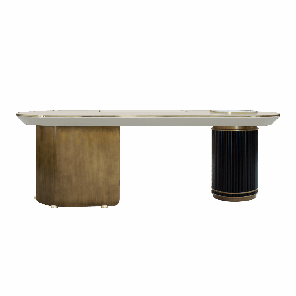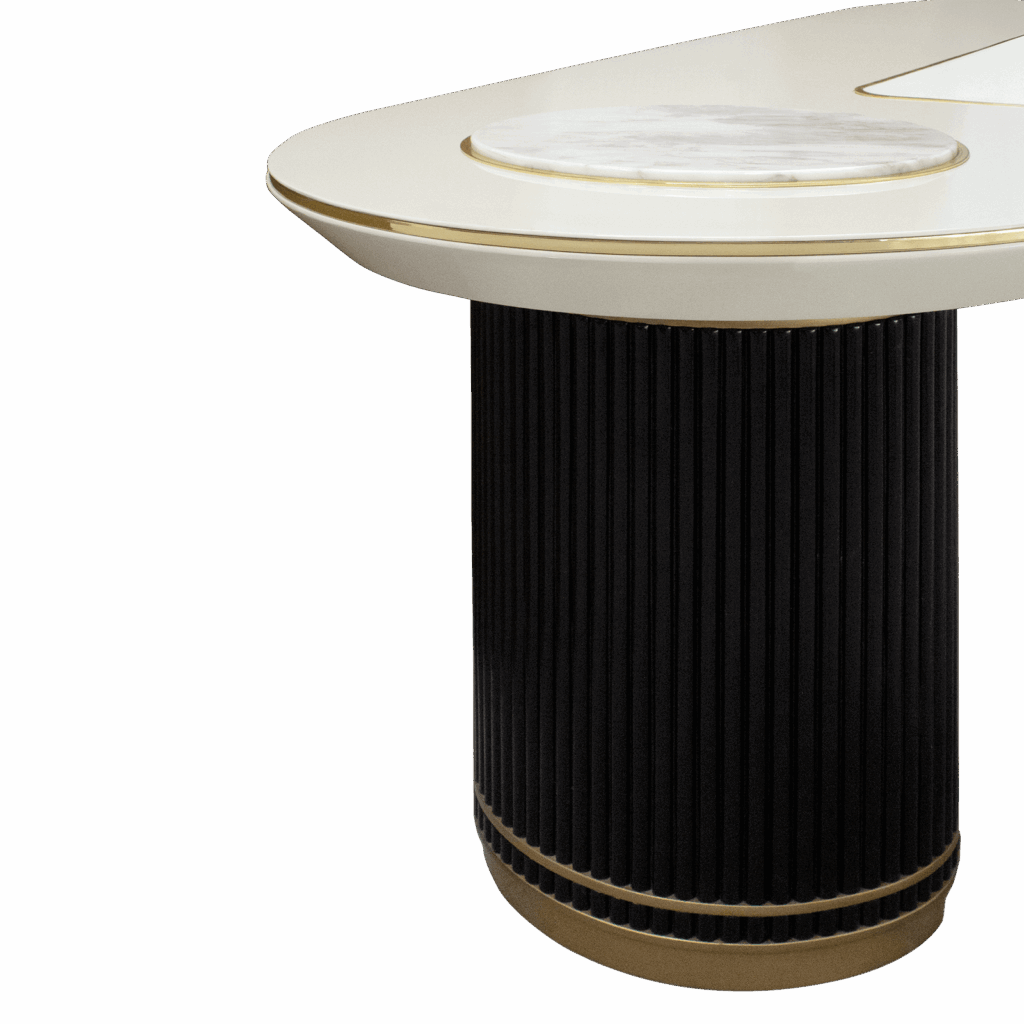 The Arizona office desk features details in marble, brass, and leather. This asymmetrical desk design keeps your interior space on trend.