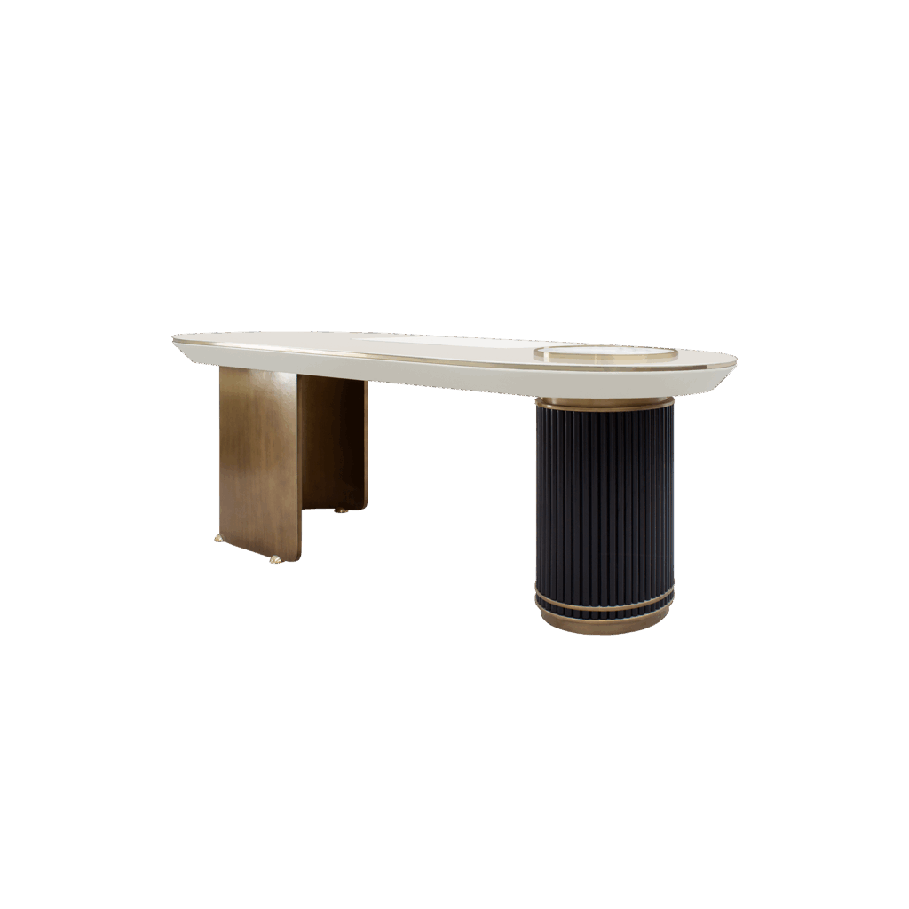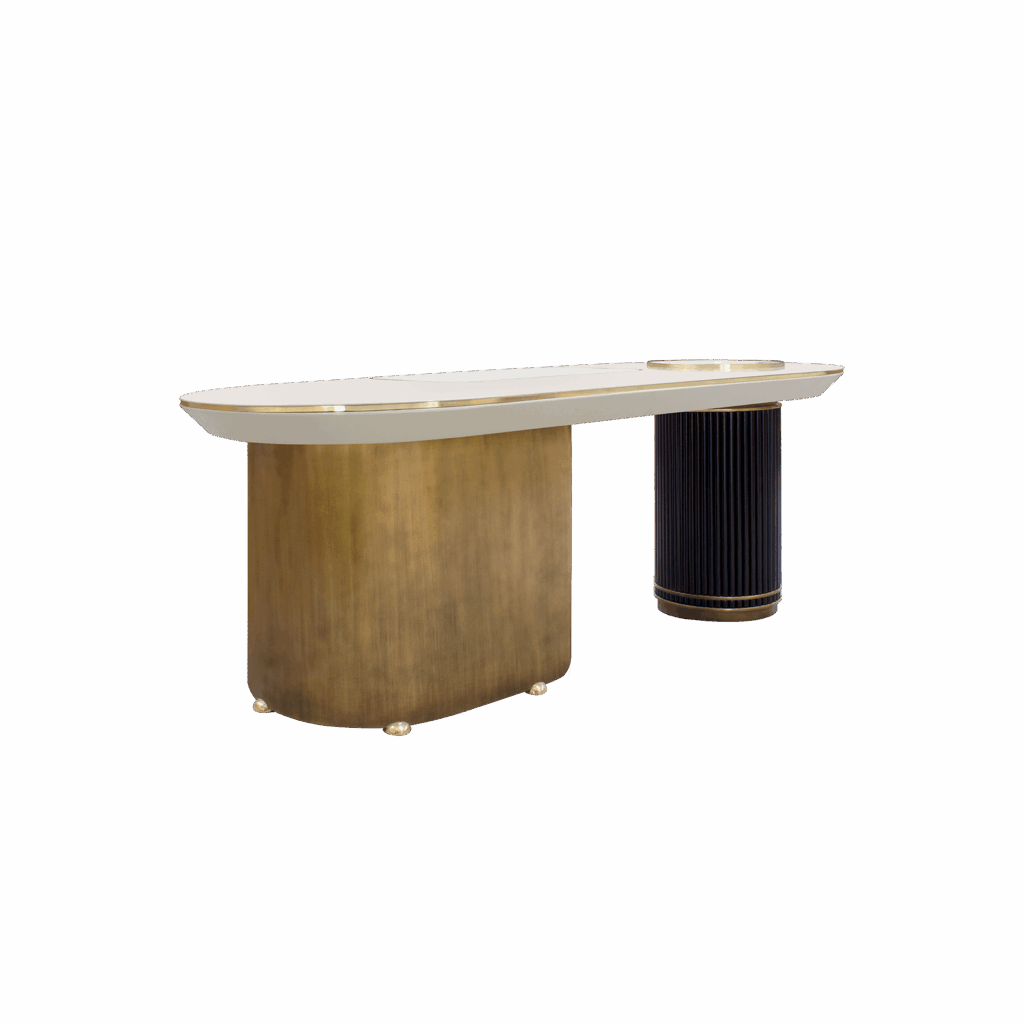 Transforming sights into deluxe living protagonists, Porus Studio designers conceived the Arizona desk. Featuring an informal balance, the lacquered wood top is supported by two asymmetric feet, one made of brass and the other in lacquered wood.