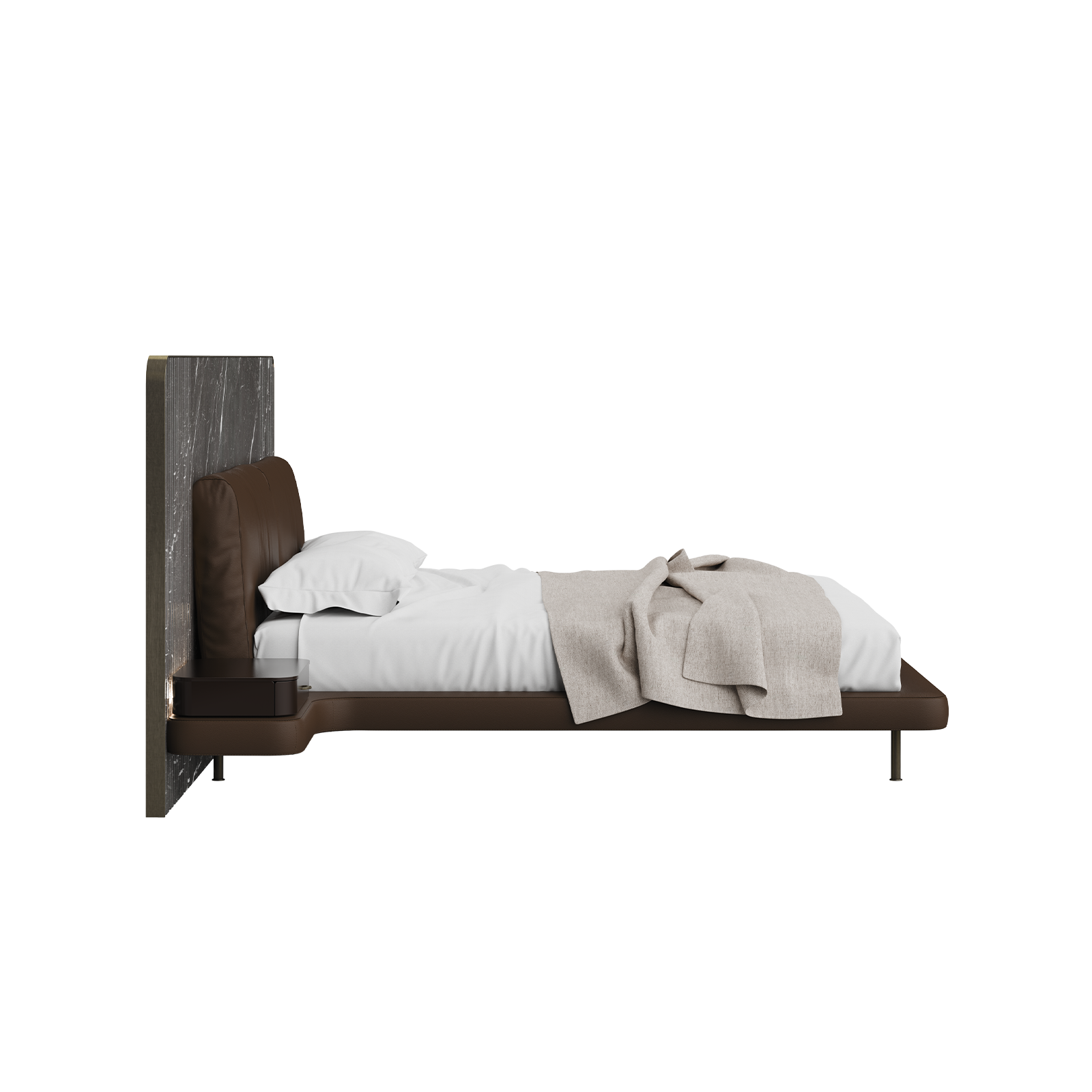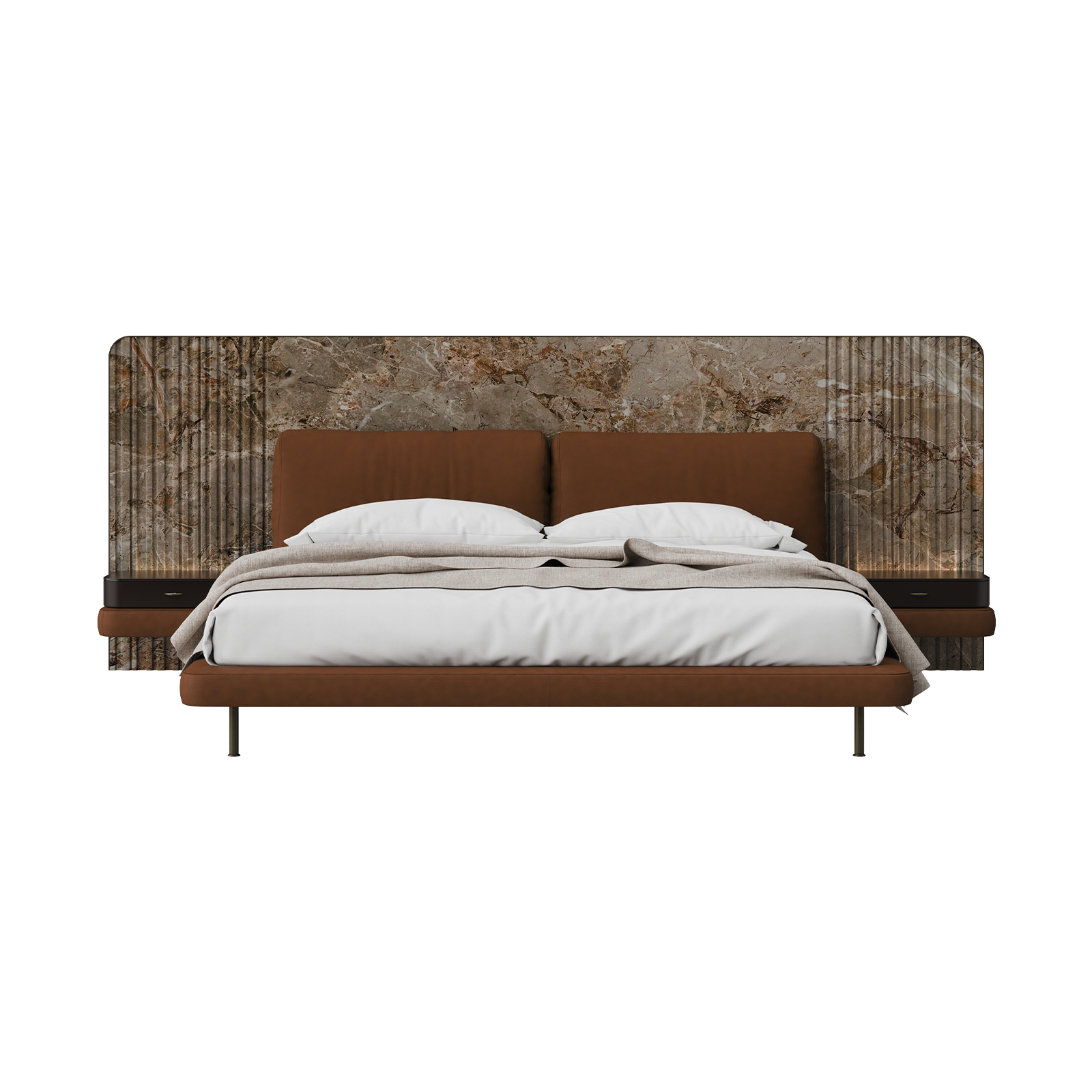 The Colorado Bed features a marble headboard combined with two leather pillows upholstered in genuine leather, embellished with details, and feet in aged brushed brass. Pick up your favorite marble between Grey Kenzo, White Estremoz, and St. Laurent, and elevate your bedroom design with an exquisite marble headboard of the Colorado Bed.